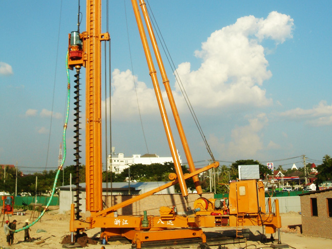 ZJB系列步履式長(zhǎng)螺旋鉆孔機(jī)由液壓步履式多功能樁架和鉆進(jìn)系統(tǒng)兩個(gè)部分組成。樁架采用液壓步履式行走機(jī)構(gòu),自動(dòng)化程度高、可進(jìn)行正反180度回轉(zhuǎn),底部設(shè)有四條液壓支腿油缸及兩條行走油缸以輔助行走及回轉(zhuǎn),同時(shí)增加施工時(shí)的整機(jī)穩(wěn)定性。鉆進(jìn)系統(tǒng)包括動(dòng)力頭與鉆具,動(dòng)力頭的輸出軸與螺旋鉆具為中空式,打樁機(jī)采用長(zhǎng)螺旋成孔,可通過(guò)鉆桿中心管將混凝土或泥漿進(jìn)行泵送混凝土CFG樁施工,即能鉆孔成樁一機(jī)一次完成。使用該機(jī)進(jìn)行鉆孔灌注樁作業(yè)時(shí),沉孔效率高、沉樁質(zhì)量好,對(duì)于穿透沙礫層效果遠(yuǎn)大于錘擊沉樁法,同時(shí)還有效避免了錘擊及振動(dòng)沉樁對(duì)地基擠壓而危及臨近建筑物的不良影響。